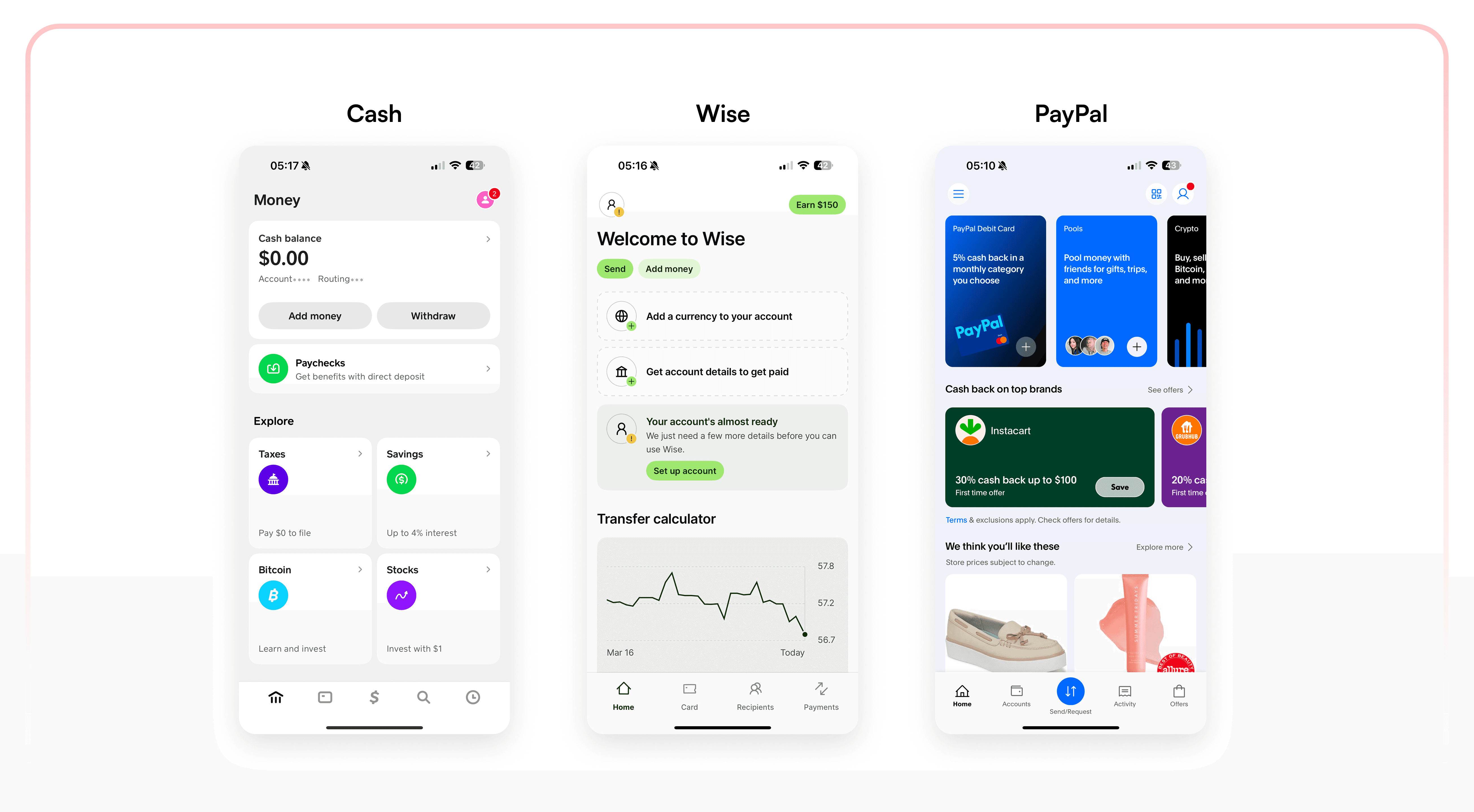 Analyze Cash, Wise and PayPal's homepage layouts, new user retention strategies, and existing user re-engagement approaches.