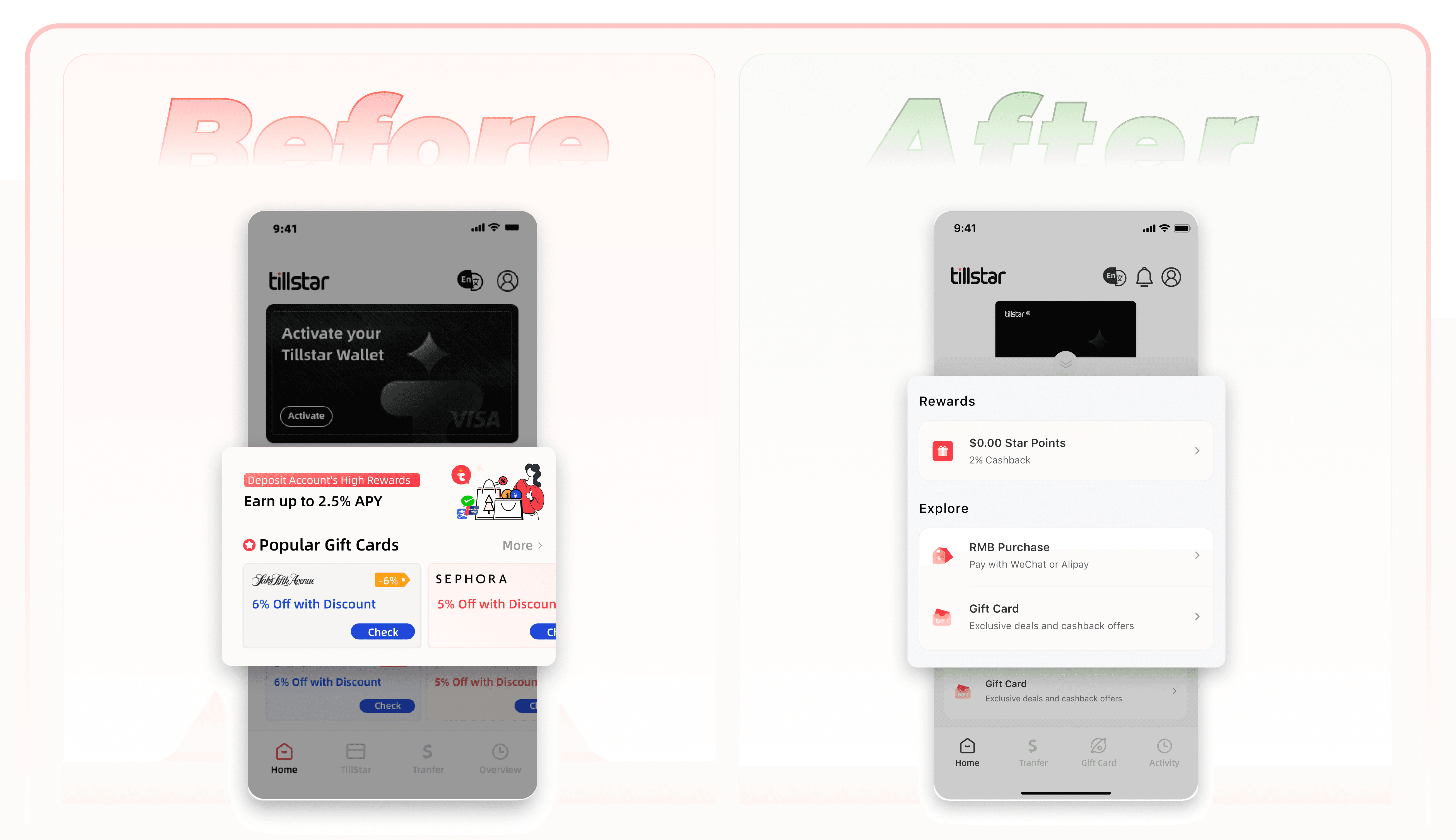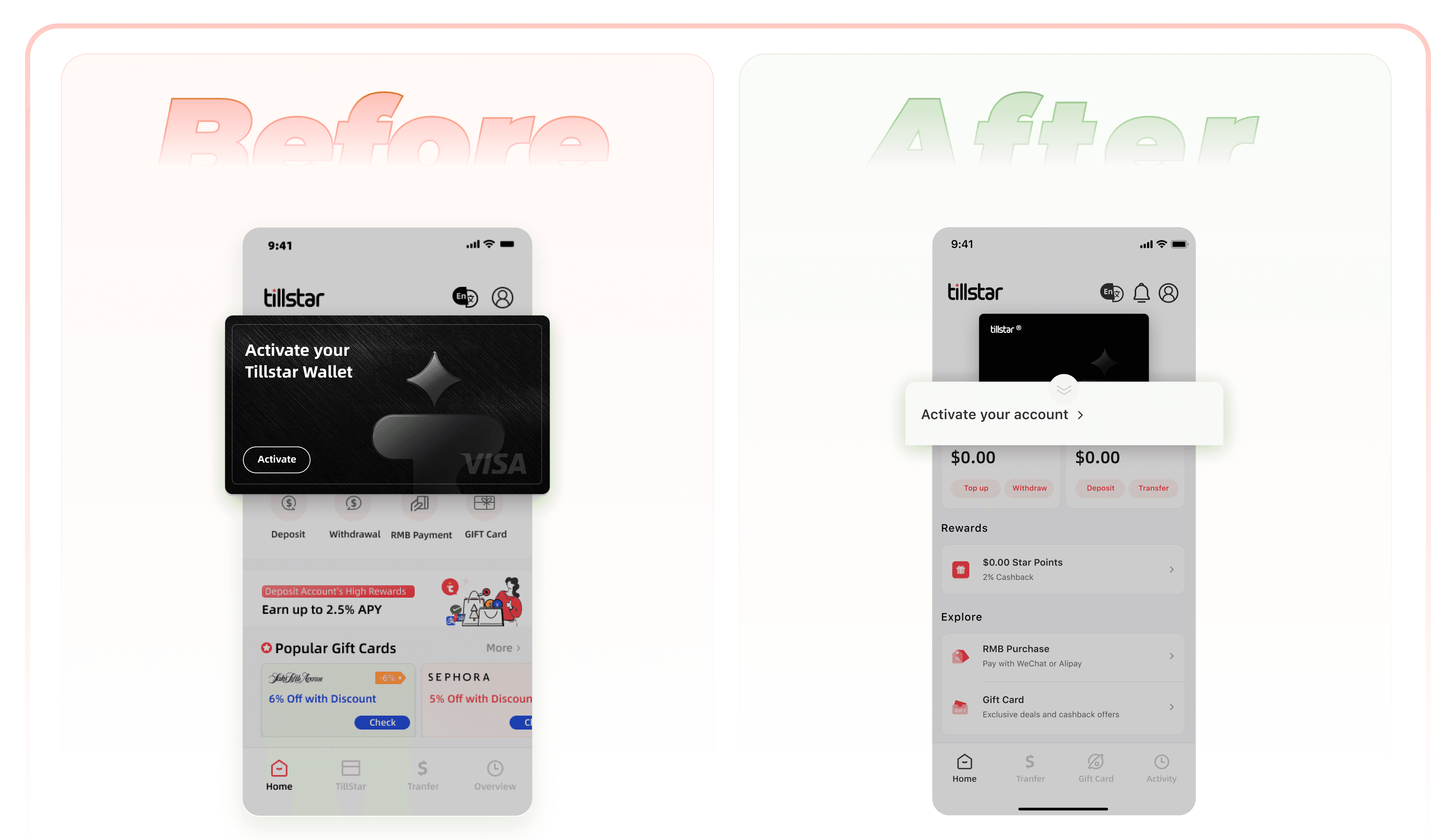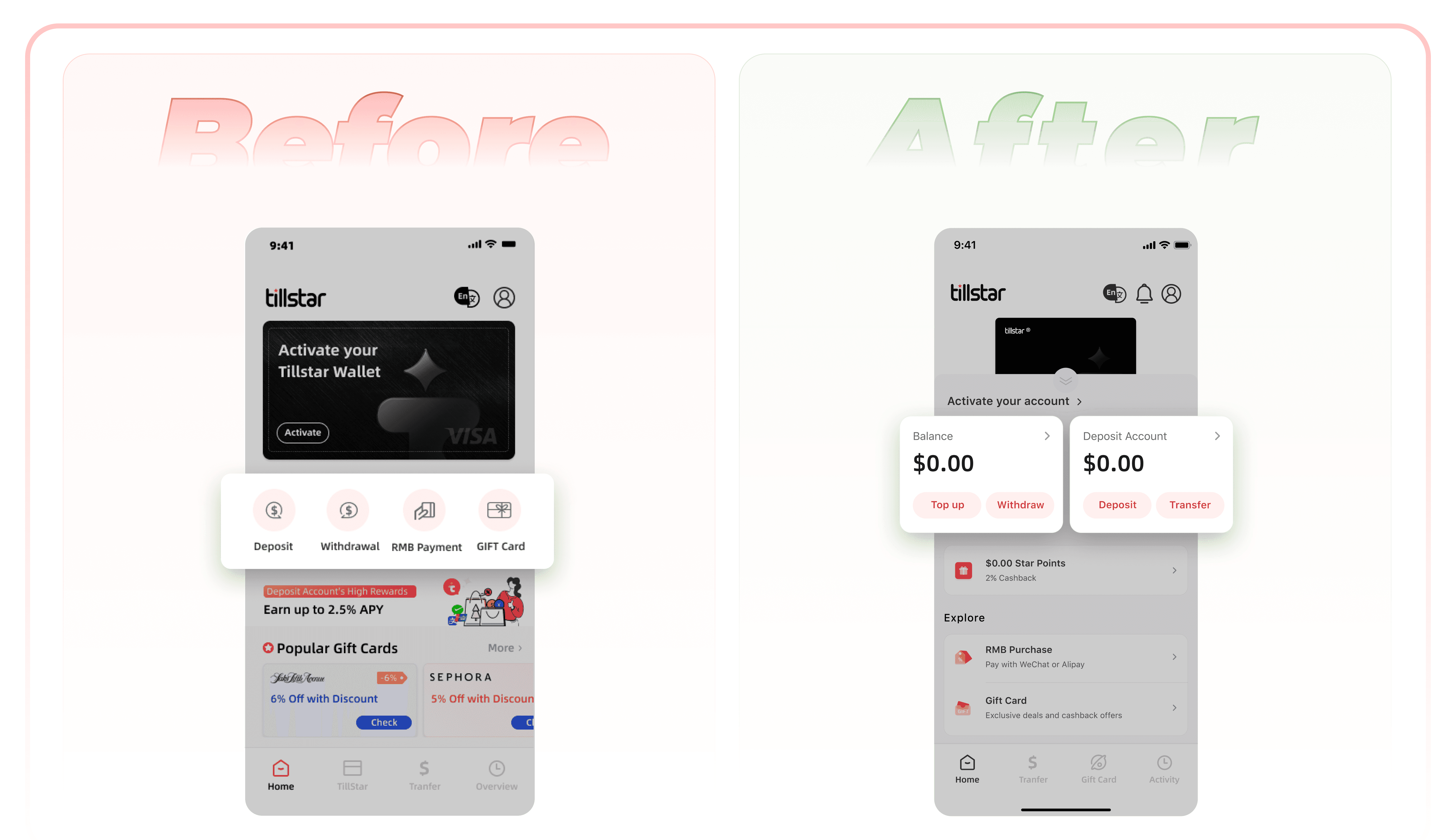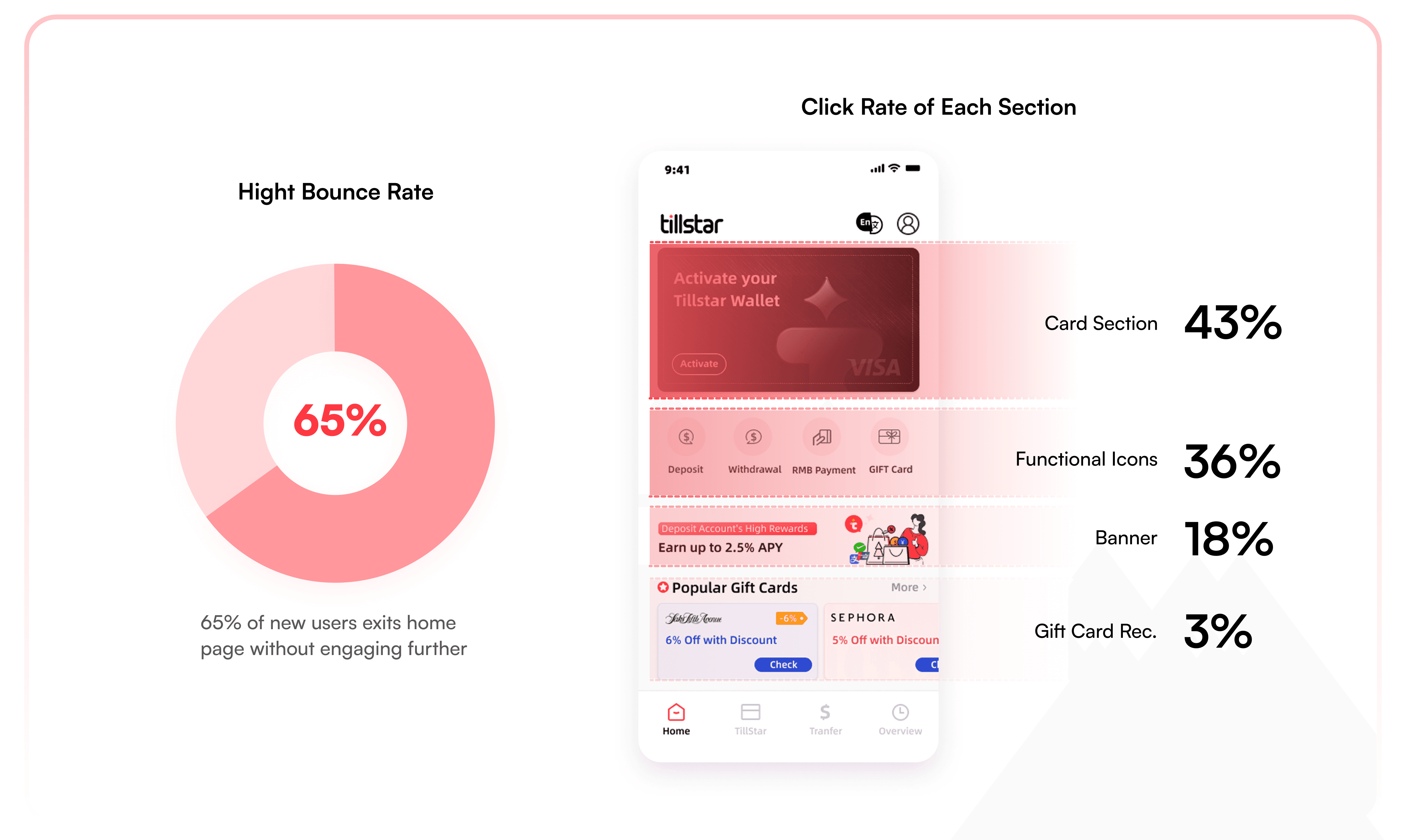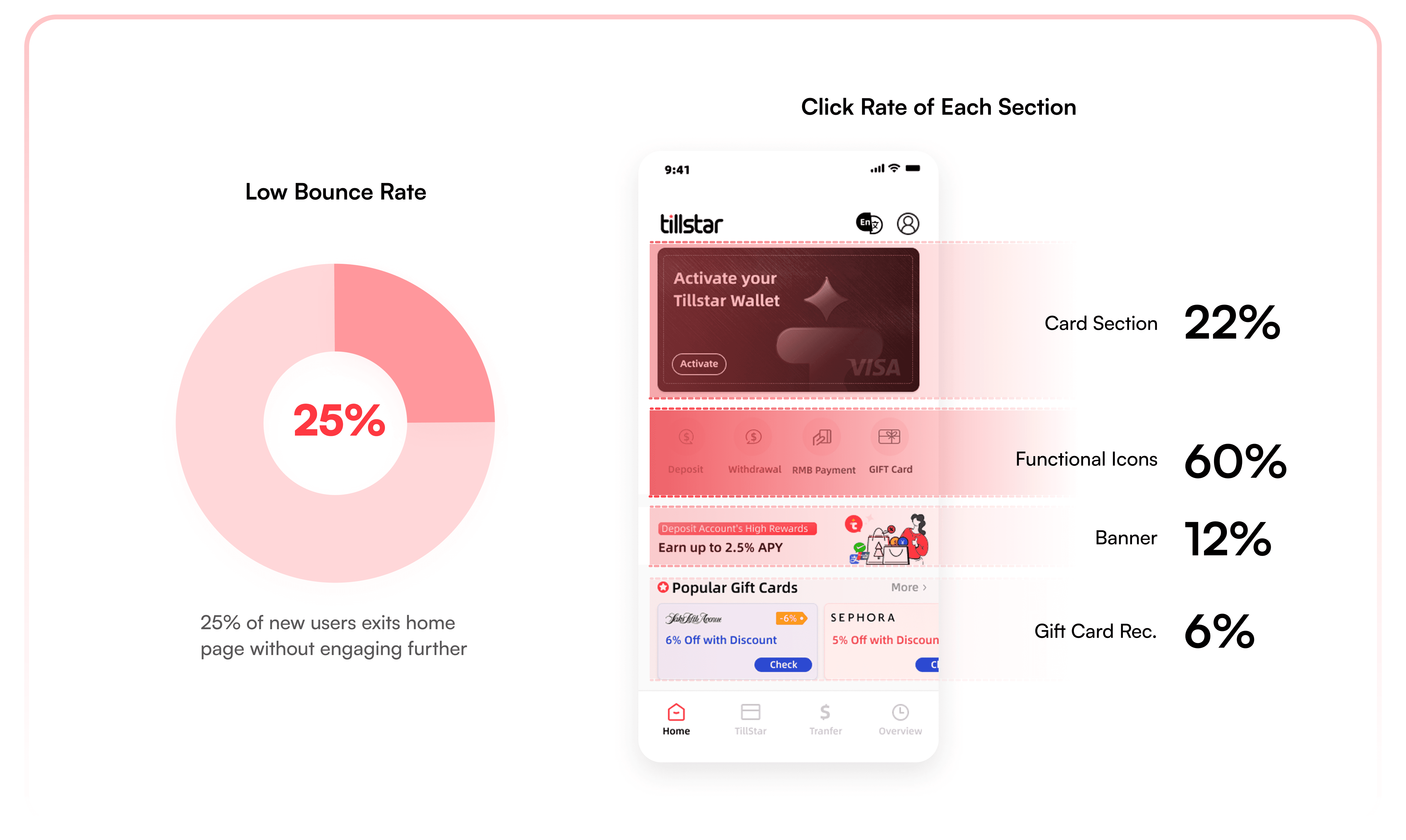 Revamped the information architecture and navigation of Tillstar Digital Wallet to enhance usability, increased monthly active users(MAU) by 28.6% and user retention by 35.7%.
