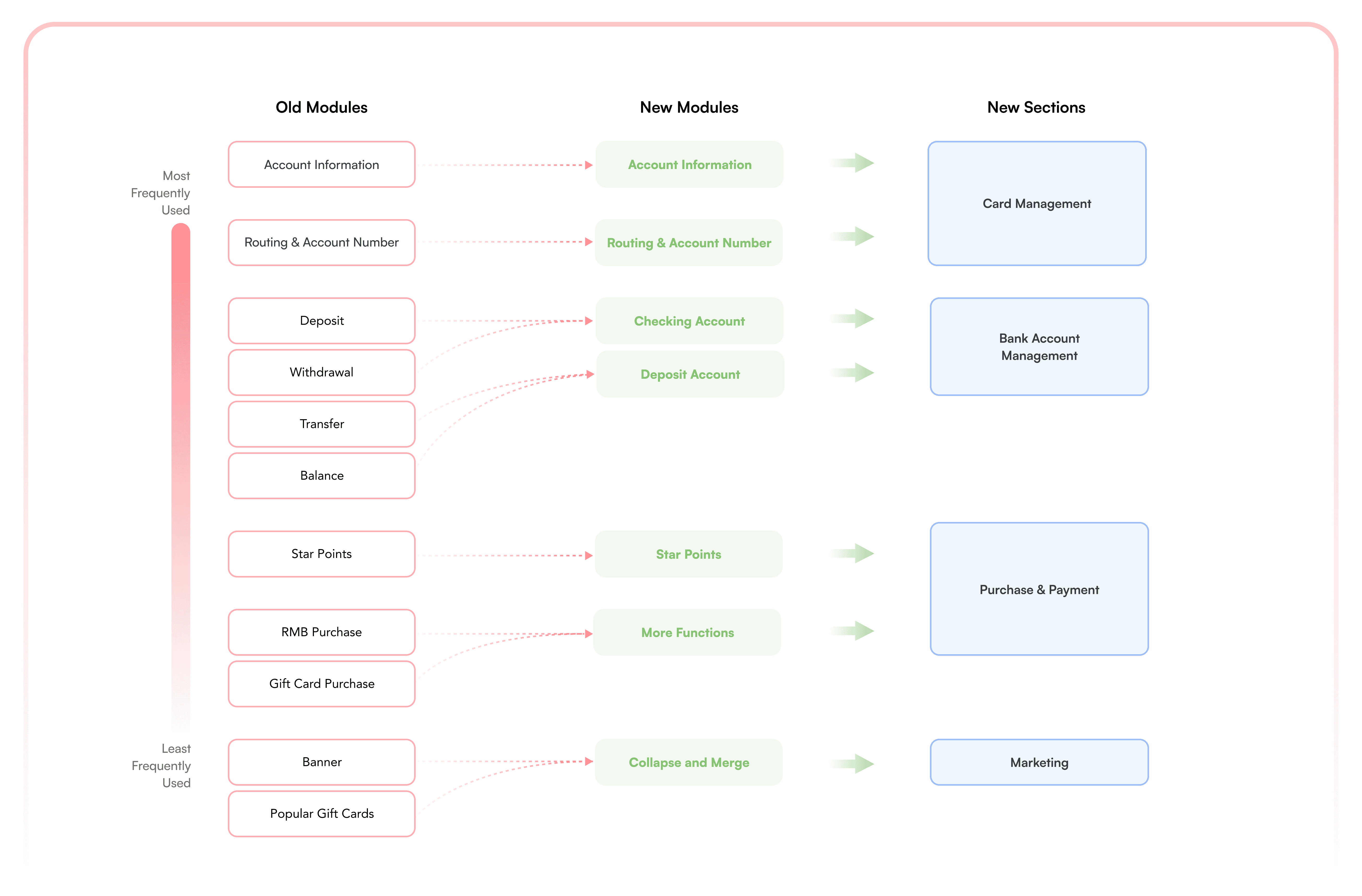 The new home page layout is broken down into sections of Card Management, Account Management, Purchase&Payment, and Marketing Materials