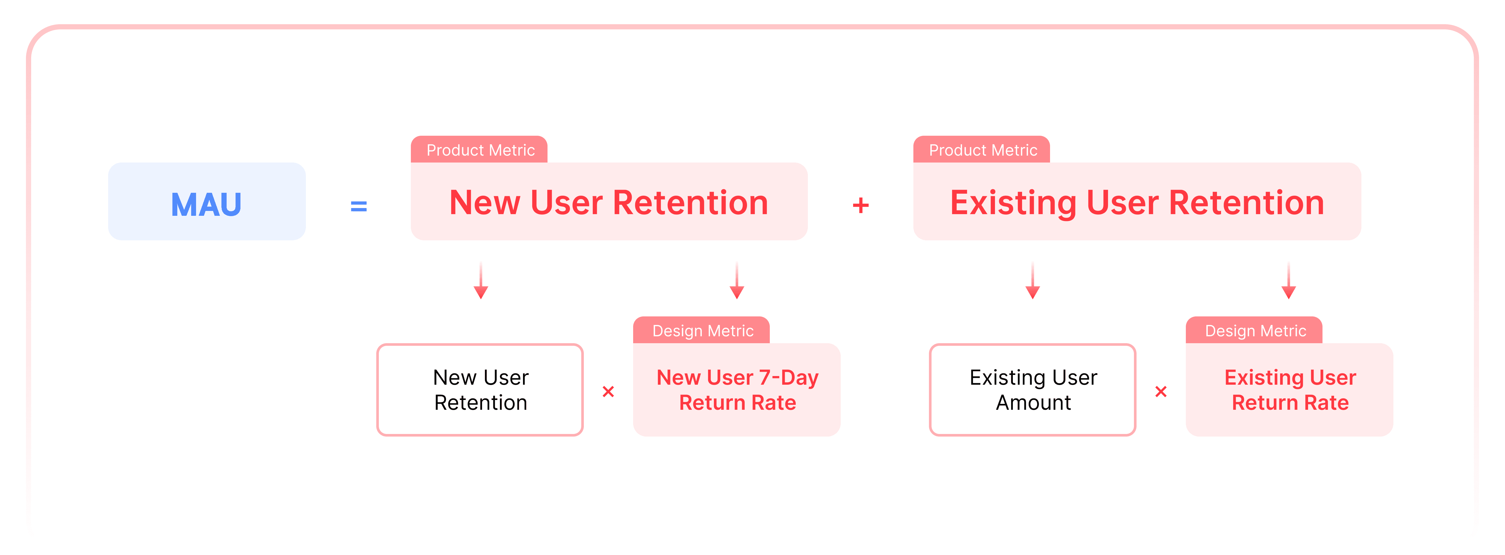 Key design metrics to improve MAU are New User 7-day Return Rate and Existing User Return Rate