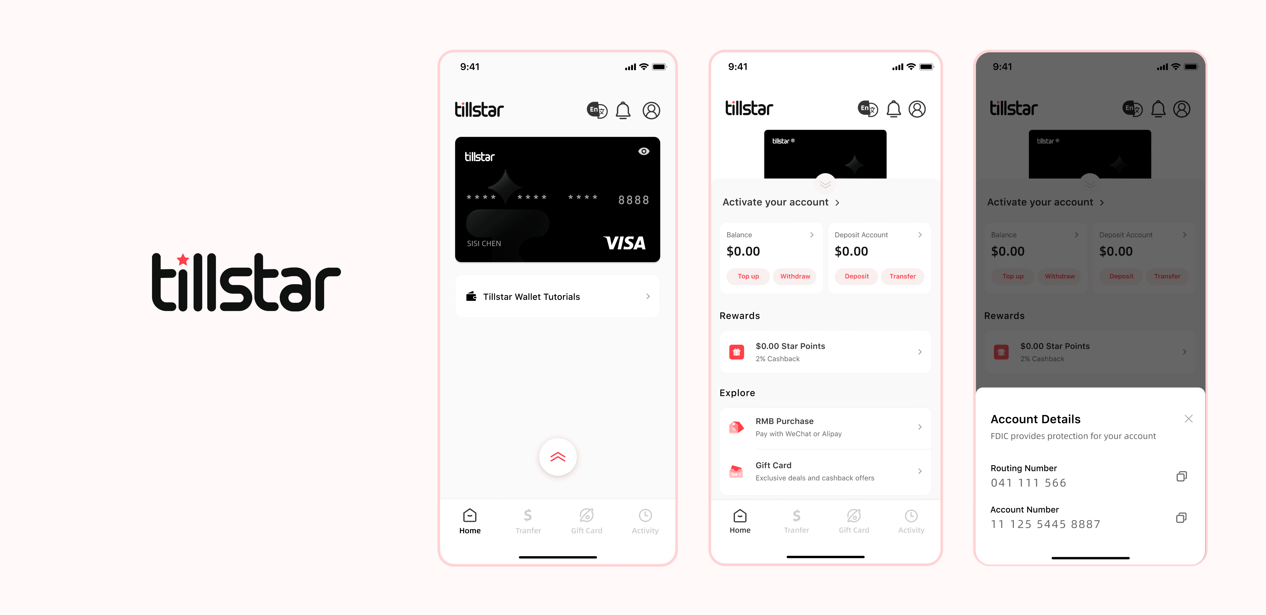 Tillstar is a cross-border digital wallet that enables non-U.S. users to open a U.S. account and pay like a local. It provides a checking-style balance and a Visa card (virtual or physical) for everyday spending and transfers.